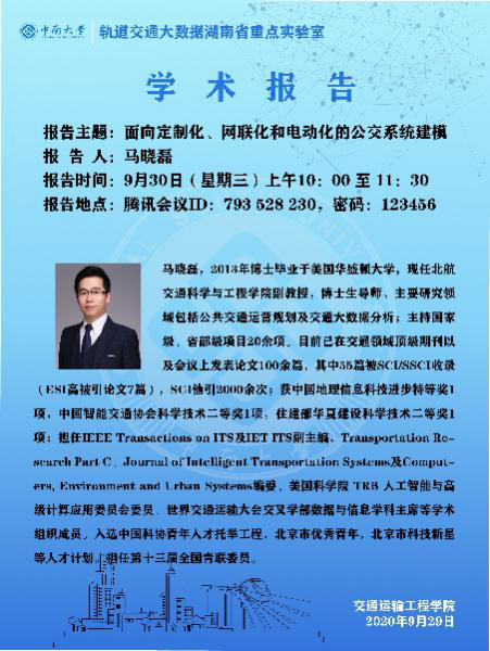 2020年9月30日上午10时,北京航空航天大学交通科学与工程必威 马晓磊副教授接受必威 王璞教授邀请,于线上举办主题为“面向定制化、网联化和电动化的公交系统建模”的学术报告,必威 陈维亚副院长,交通运输系徐光明...