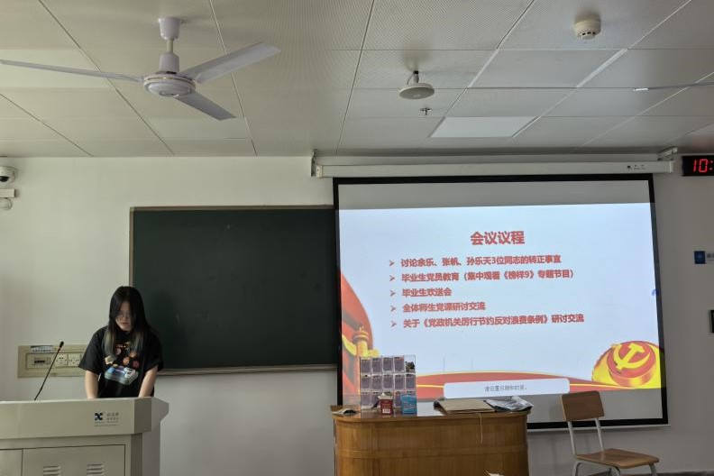 6月13日10:00,研究生第二党支部在世纪楼A103教室召开全体党员大会。会议由支部书记李涵同志主持,支部全体党员参加会议。会议议程包括预备党员转正、毕业生党员教育、毕业生欢送、党课研讨、厉行节约条例学习交流及重温入党誓词。