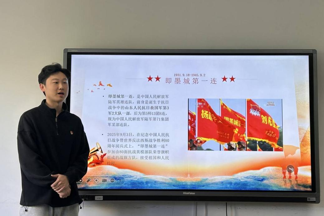 郑苑同志给大家分享的是家乡“即墨城第一连”的抗日故事。“即墨城第一连”是中国人民解放军陆军英雄连队,前身为山东抗日救国军第3军2大队一部,现隶属第71集团军某旅。1945年8月解放即墨城战斗中,该连率先登城突破,以刺刀战术歼敌3000余人,被胶东军区授予荣誉称号。连队传承“刺刀见红、无坚不摧”精神,在抗洪抢险、军事比武等任务中表现突出,在纪念中国人民抗日战争暨世界反法西斯战争胜利80周年大会上其战旗亮相天安门。通过了解“即墨城第一连”的抗日故事我们深刻认识到,作为新时代的党员,我们要传承这种攻坚克难、勇于胜利的精神,将红色基因融入血脉,在本职岗位上履职担当,再立新功。