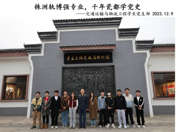 为深入贯彻习近平新时代中国特色社会主义思想,培养专业素养,厚植家国情怀。12月9日,交通运输与物流工程学生党支部赴轨道交通名城株洲和陶瓷之乡醴陵,开展“株洲轨博强专业,千年瓷都学党史”主题党日活动。此行不仅加深了同志们对轨道交通和装备制造行业的了解,也让每一位成员在感受红色文化和传统陶瓷艺术中收获了宝贵的精神财富。