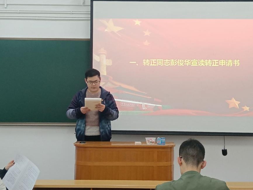 会议伊始,王羽珊同志介绍了会议流程和要求。随后,彭俊华、罗堉青、尚星月、官群雄四位同志依次宣读《转正申请书》,向全体同志汇报自己在预备期内的学习工作情况以及取得的进步和不足之处。