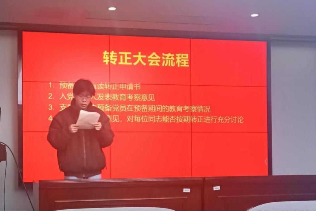 会议伊始,李朵同志介绍会议流程及要求。随后,刘宇杰、李欣语、齐萌、卫诗豪四位同志依次宣读转正申请书,入党介绍人介绍其基本情况,支委会报告其在预备期内的教育考察情况,最后与会党员同志发表意见。经过讨论,支部一致认为刘宇杰、李欣语、齐萌、卫诗豪四位同志在一年的预备期内以党员标准要求自己,并发挥了党员的模范带头作用,符合成为正式党员的标准。在支部正式党员进行无记名投票表决后,大会同意以上同志按期转正,成为中共正式党员。支部书记石晓琪同志宣布会议结果,向转正的四位同志表达祝贺,并为他们送上政治生日纪念卡。石晓琪同志提到,希望四位转正的同志今后以一名优秀党员的身份严格要求自己,积极向身边的优秀党员同志学习,不断激励自我、改善自我。