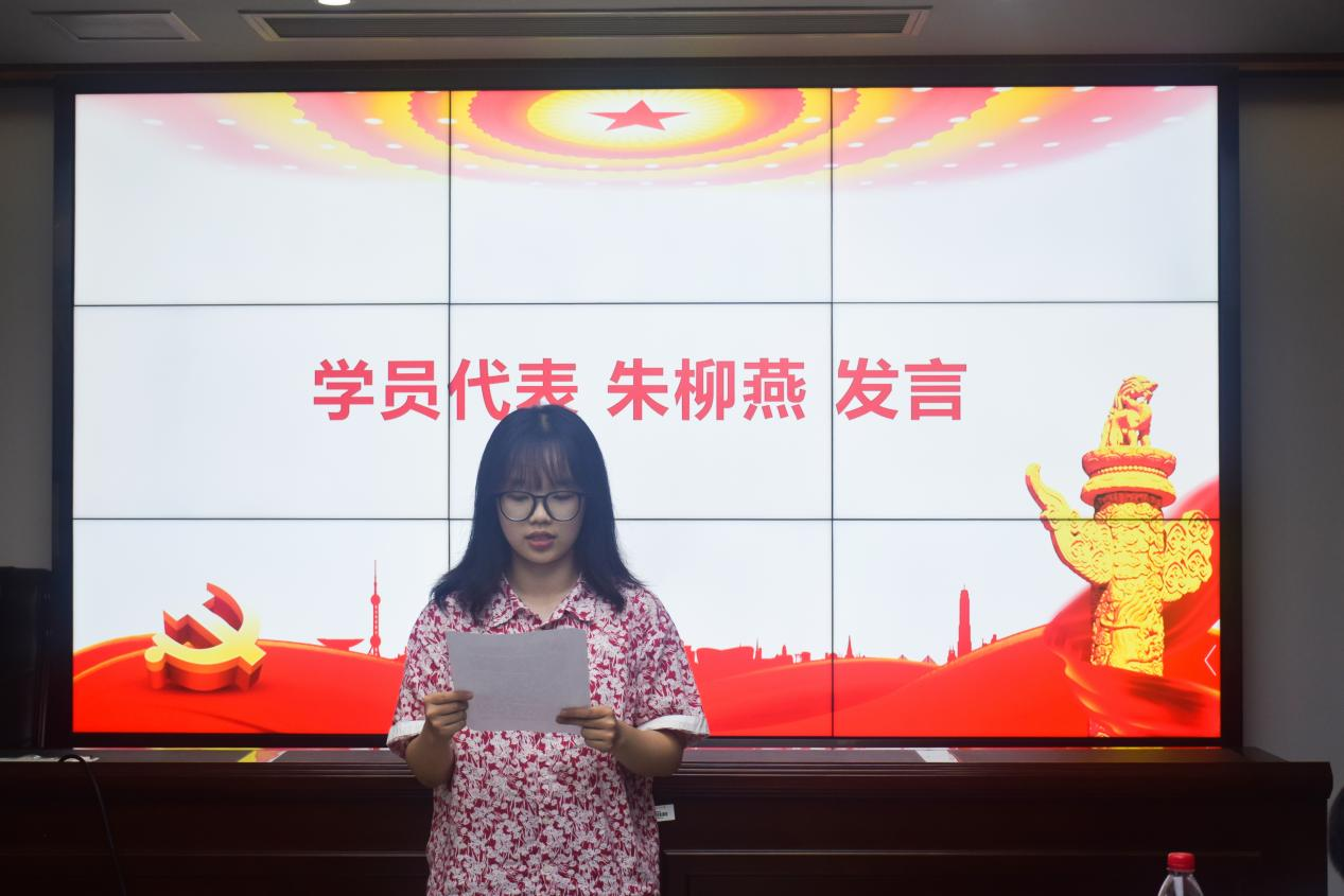 典礼伊始,全体起立奏唱国歌。随后,朱柳燕同志代表培训班全体学员发言。她表示,在二十多天的党校培训中,除课堂理论知识学习外,同学们还前往了湖南烈士公园、岳麓书院等校外党性教育基地进行社会实践,实地探索红色教育基地,不仅深化了对共产党的认识,同时也坚定了加入共产党的决心。她号召同学们,作为新时代社会主义的建设者和接班人,应怀揣远大理想,珍惜美好光阴,发奋读书、刻苦钻研,牢记学用结合、以知促行、知行合一,提升自身的政治素质和理论素质,坚持以高标准要求自己,争做济世之英才,奏响盛世之华章。随后,由张佳琪老师宣读本次发展对象培训班结业学员名单。