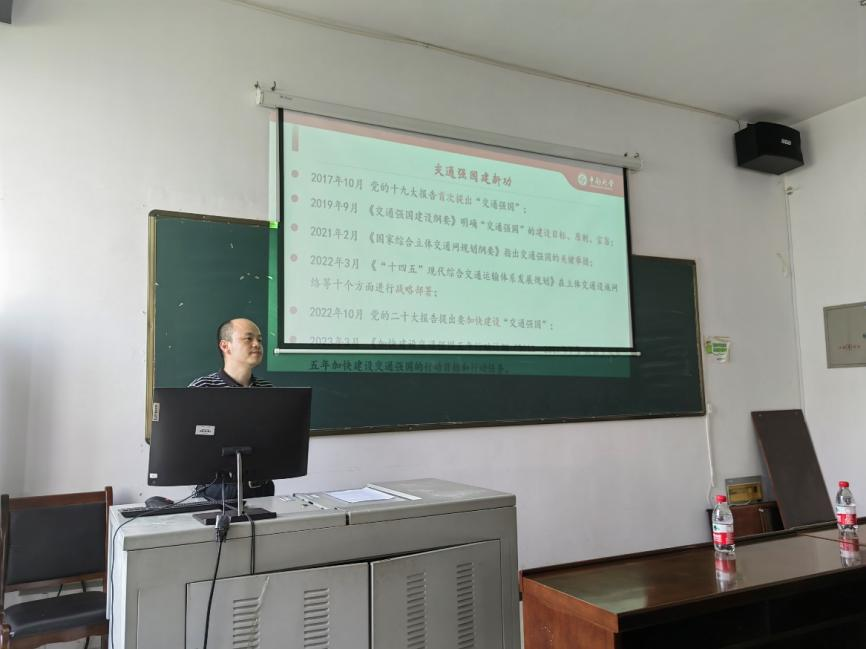 在党课第二部分,刘辉院长解读了交通强国建设取得的系列成就。他指出,自党的十九大以来,国家对交通强国战略的重视程度持续增加,创新发展步伐持续加快,我国交通运输行业取得了历史性成就。他结合学院近年来取得的优异成绩,勉励广大交通学子继承和发扬前辈们胸怀祖国、服务人民的优秀品质,用坚持不懈的奋斗擦亮青春的底色,掌握真才实学,担负国家兴亡,努力成为可堪大用、能担重任的栋梁之材,不断把中华民族复兴伟业向前推进!