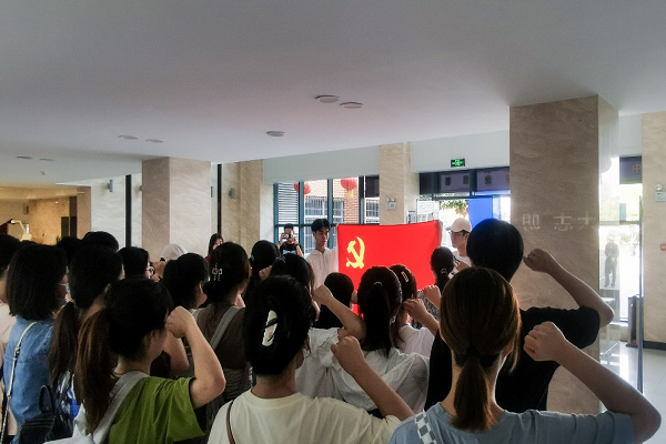 活动最后,大家在毓秀楼门厅集合,由周婧盈同志领誓,支部全体同志右手握拳、面向党旗重温入党誓词,重温革命先辈对后辈的殷勤期望,重温党员对党、对人民的庄严宣誓。