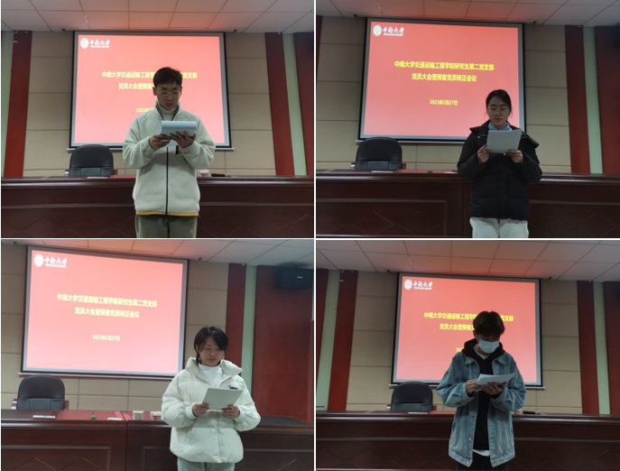 2月27日晚上19:00,交通院研究生第二党支部于交通楼513教室顺利举行全体党员大会暨预备党员会议。会议主要分为讨论张金宝、王梦婷、赵胜雯、杨展豪四位同志转正问题以及二十大精神学习分享两个环节。本次大会由组织委员蒋艾佳同志主持。