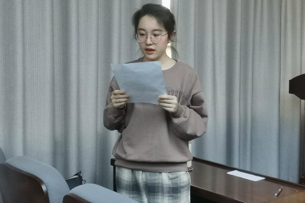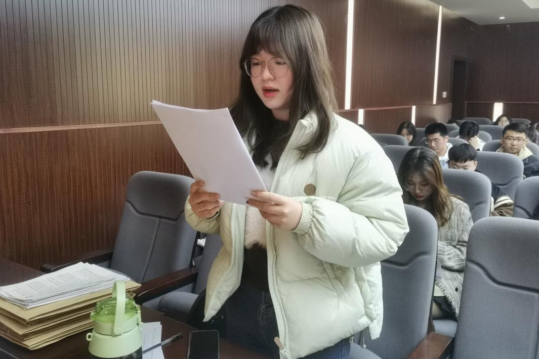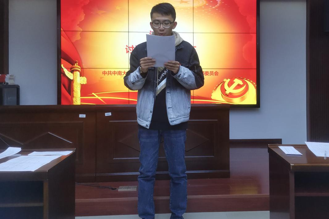会议伊始,在支部书记刘家忱同志介绍完会议的流程及要求后,支部大会开始讨论预备党员转正的相关事宜。黄钰钧、李小杰、张颖、光可欣、童诗瑛、邓振良、王雅馨、王宇芬八位同志依次上台宣读转正申请书,汇报了个人成为预备党员后在政治思想、学习生活、工作表现等方面的基本情况,并进行了自我总结和批评。