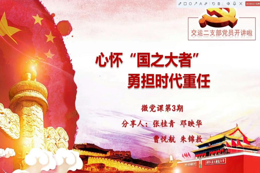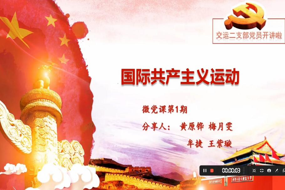 4月25日至5月1日,为学习贯彻党的十九届六中全会精神,深入推进党史学习教育,贯彻执行“三会一课”制度,让支部同志从“坐着听党课”向“主动学习,讲好党课”转变,交通运输第二学生党支部开展“交运二支部党员开讲啦”微党课活动。