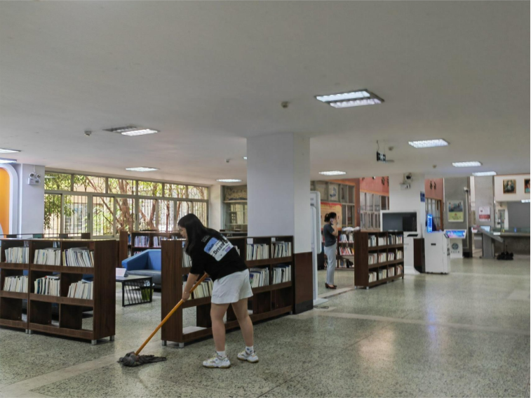 本次志愿活动中,支部的党员同志分为两个小组分别进行卫生清洁与书籍整理工作。清洁小组主要负责一楼大厅卫生清洁工作,包括打扫地板、整理阅读角书柜、擦拭刷卡机器及书架、清洗花坛假花及窗台等。同志们共同发挥了集体作用,减轻了工作人员的负担。在清洁小组所有党员同志的共同努力下,一楼的大厅整洁明亮,焕然一新。