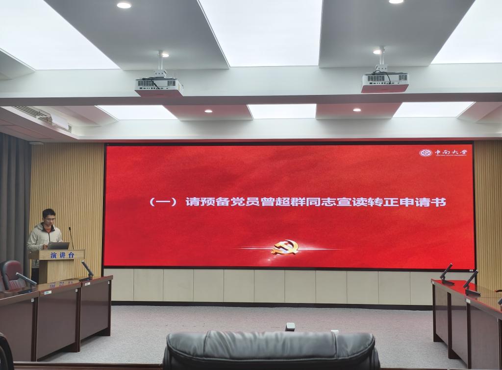 11月28日19:00,研究生第四党支部在3D会议室召开接收预备党员、预备党员转正大会暨学习贯彻党的二十届四中全会精神主题党日活动,讨论接收周舒佳、祁小伟为预备党员及曾超群同志的转正事宜,会议由党支部书记梁云斌同志主持。