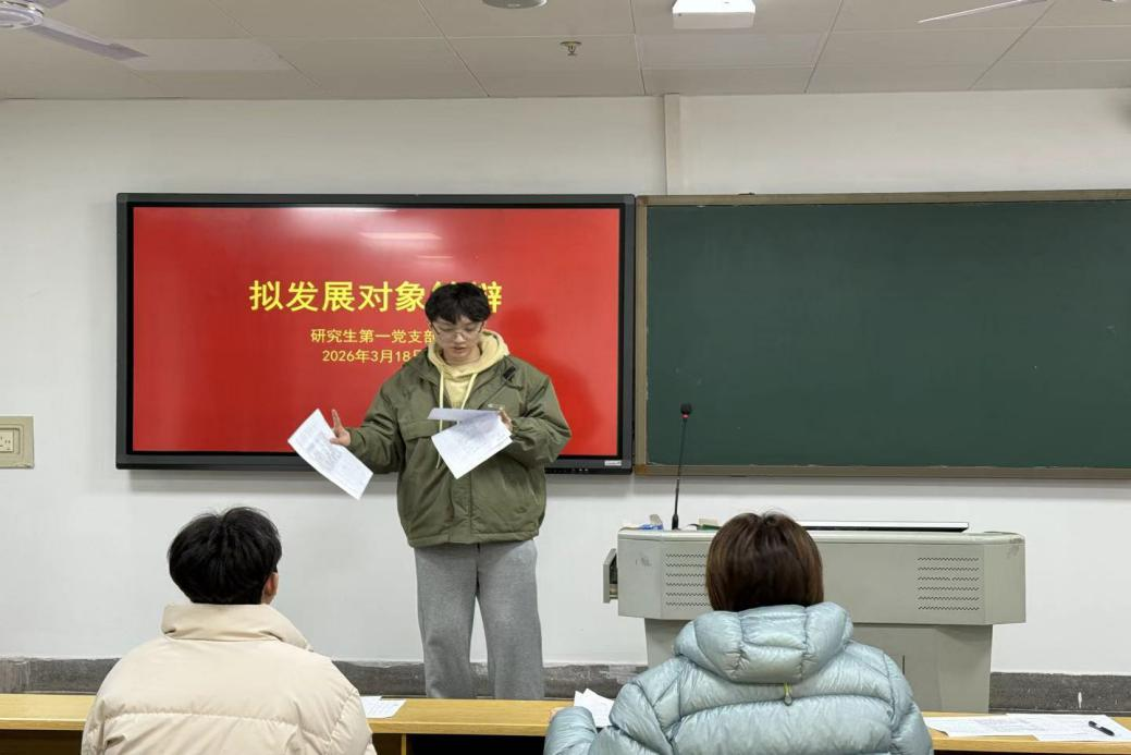 为进一步推动党员发展工作,确保党员发展工作的科学性和规范性,研究生第一党支部于3月18日16:30在世A105举行2026年春季发展对象答辩会。会议由支部书记刘思序同志主持,17名发展对象评选委员会成员及5名入党积极分子参加此次会议。