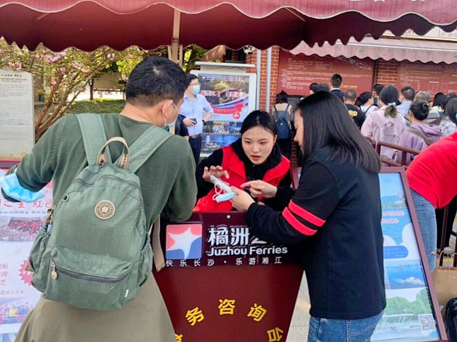 活动伊始,志愿者们于橘子洲游客服务中心准时集合,并与橘子洲景区工作人员进行任务交接。在工作人员的安排下,志愿者分为三队,分别负责游客服务中心前台和前坪的咨询、引流,以及橘子洲景区梅园区域的服务事项。