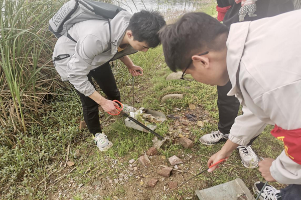活动伊始,同学们领取了巡河工具和志愿者袖章。接着,同学们紧跟志愿者爷爷奶奶们进行玉带河的巡河活动,他们认真搜寻河道边、草丛中掩藏的不可降解垃圾,并将其挑拣出放入准备好的垃圾袋中。在巡河过程中,同学们清理了许多隐藏在问渠长廊草丛深处的大大小小的各种对环境污染很大的垃圾,包括烟头、食品包装袋、塑料碎片等。