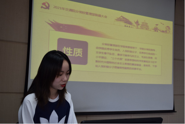 会议最后,由党组织干事朱显研老师讲话。她首先对自身经历做了简介,并代表领导与老师对上一届成员表达了感谢,对新成员的到来表示了欢迎。之后,她对分党校管理部新学年的工作做出了详细指导,如增开党史专栏、融入学年特色及做好党员大会前期准备工作等。