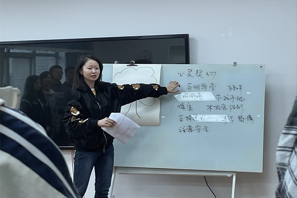 本次活动分为三个环节,即制定心灵契约、挑战趣味游戏、漫谈大学生活。活动伊始,指导老师与同学们一同制定心灵契约,并在活动过程中严格遵守。随后进入游戏环节,同学们团结一致,携手完成了一项又一项的挑战。在欢乐的笑声中同学们逐渐进入放松状态,“名字滚雪球”“解开千千结”等一系列热身游戏也使氛围逐渐活跃起来。在活动的最后,同学们在便利贴上写下自己对理想大学生活的憧憬与愿望,将其贴在“许愿树”上交给心理委员统一保管,并与“许愿树”合影留念。