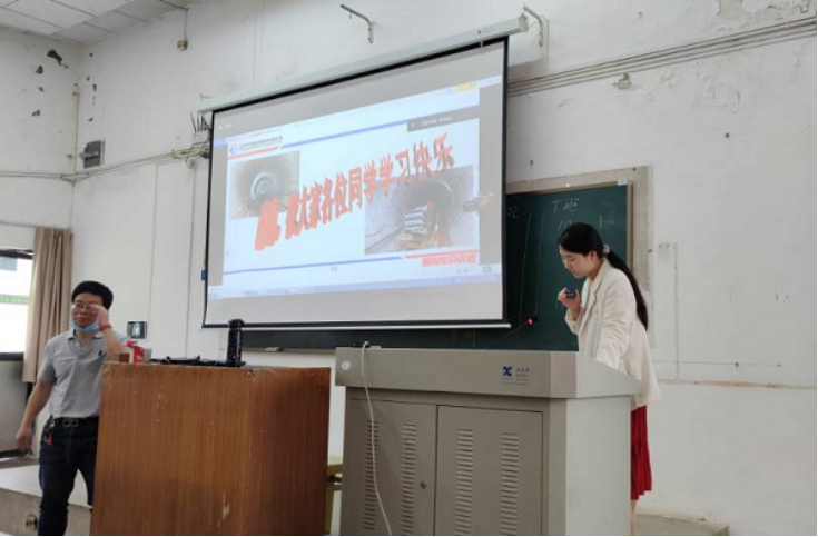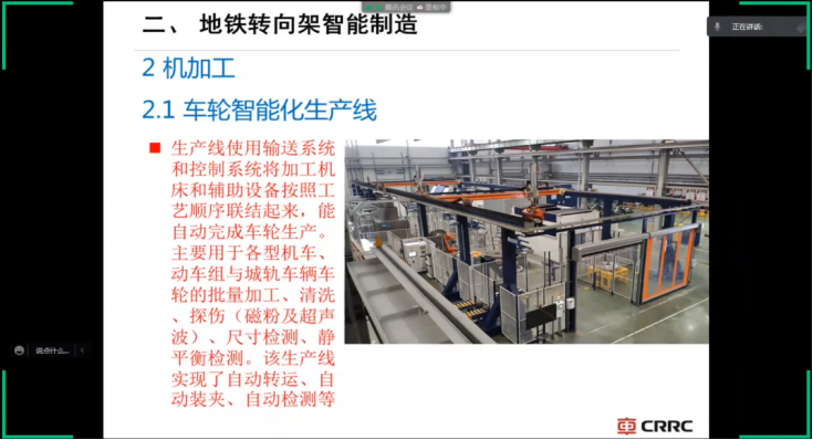 最让同学们身临其境的是5月4日下午的实习内容,各同学跟随中车四方机车车辆股份有限公司的何忠明老师学习了有关“城轨车辆制造检修技术”的专题讲座,王老师以PPT讲解和现场直播的方式为同学们讲解了地铁车体转向架的组装、涂装作业、车下设备如高低压箱、车内设备安装和落车试验。同学们就像实地实习参观一样,对地铁的车内车外装置有了更加详细的认识。