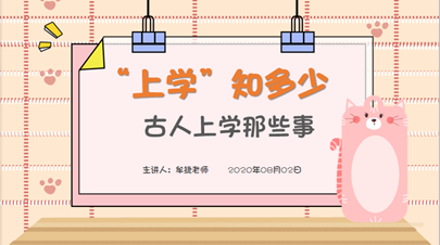 下午,为呼应“开课”主题,团队成员牟捷在线上开展了《“上学”知多少之古人上学那些事》主题课程。首先牟捷从古人上学地点、学习内容、授课方式与考试制度四个方面介绍了古人求学相关事宜,旨在向孩子们科普中国古代趣味知识,弘扬优秀中华文化,并进行思想品德辅导。随后牟捷节选了《千字文》的经典片段,组织同学们进行一次国学经典朗读活动,让同学们沉浸在国学经典之中。最后牟捷向同学们播放了《中华勤学故事》系列动画中《贾逵隔篱偷学》与《苏东坡应试》两则故事,激励同学们学习勤学苦读的优秀品质,养成良好学习习惯,珍惜当下学习环境,树立远大理想。同学们观看后感触良多。