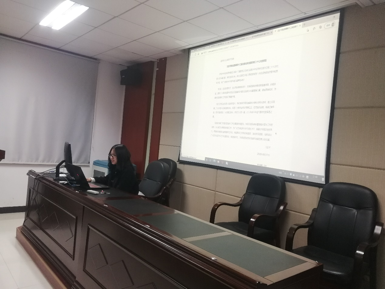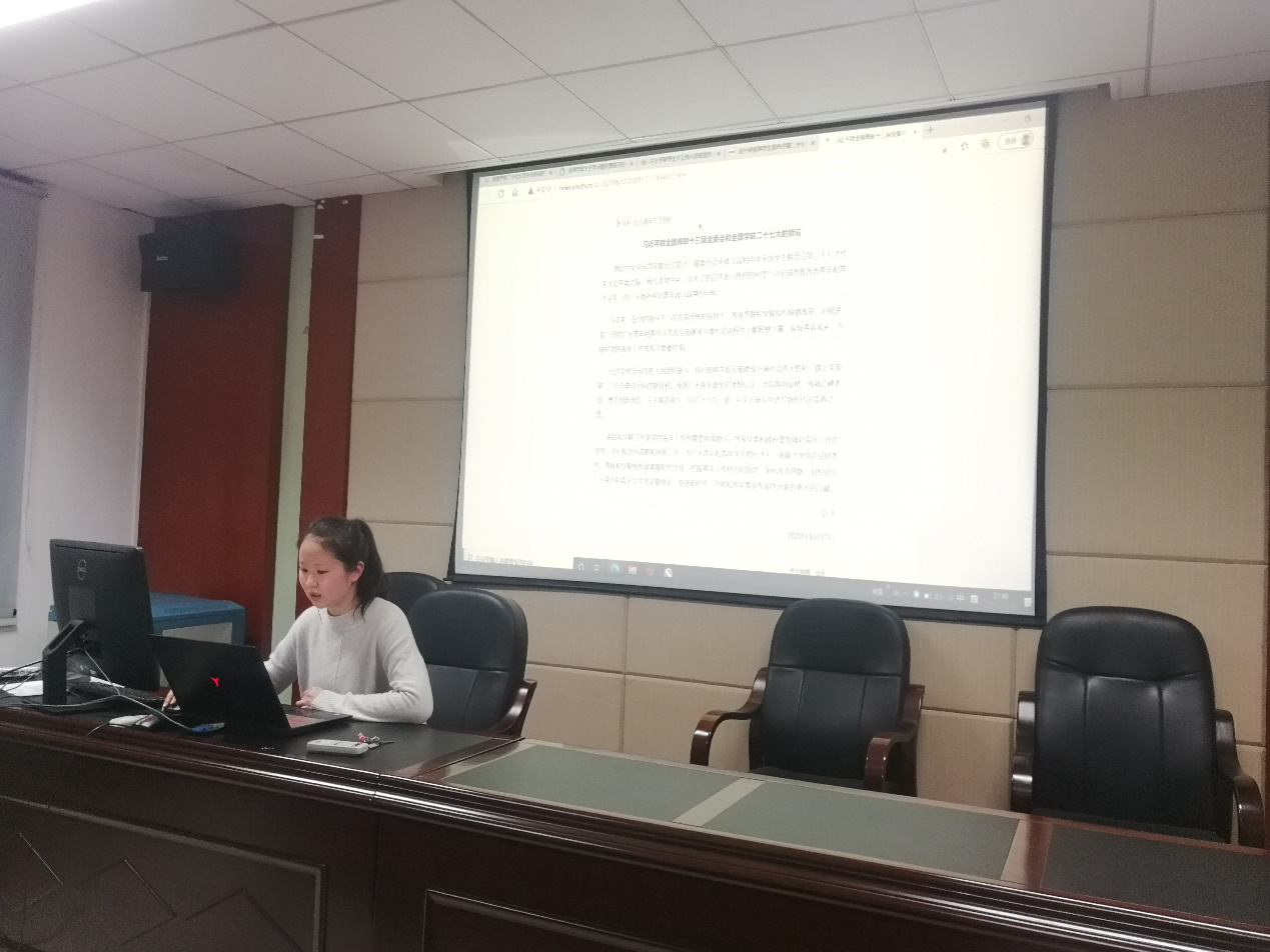 学生会主席张普阳带领大家学习党中央题为《唱响新时代爱国团结跟党走的青春之歌》的致辞精神,致辞中提出习近平总书记高度重视青年工作,强调“青年工作,抓住的是当下,传承的是根脉,面向的是未来,攸关党和国家前途命运”。