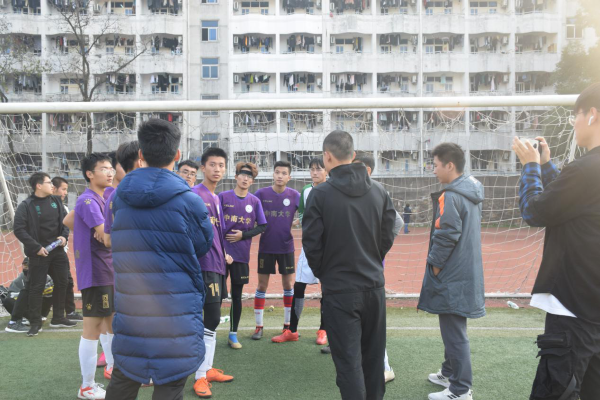 比赛上半场结束,交通院输掉一球,但球员们并不气馁,认真聆听教练对于下半场的战略部署。交通院足球队一路走来,连胜几场小组赛,究其原因,除球员自身实力强之外,更离不开教练指导有效的战略部署。