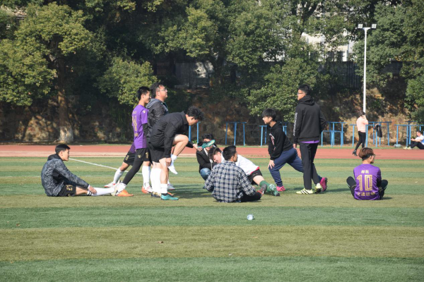 正式比赛还未开始时,队员们提前热身。大家斗志昂扬,激情澎湃,绕半个足球场慢跑两圈后集合,进行压腿。他们脸上洋溢的自信笑容与冬日的暖阳交相辉映,和谐的画面简单却美好,展现出了当代大学生的青春活力。