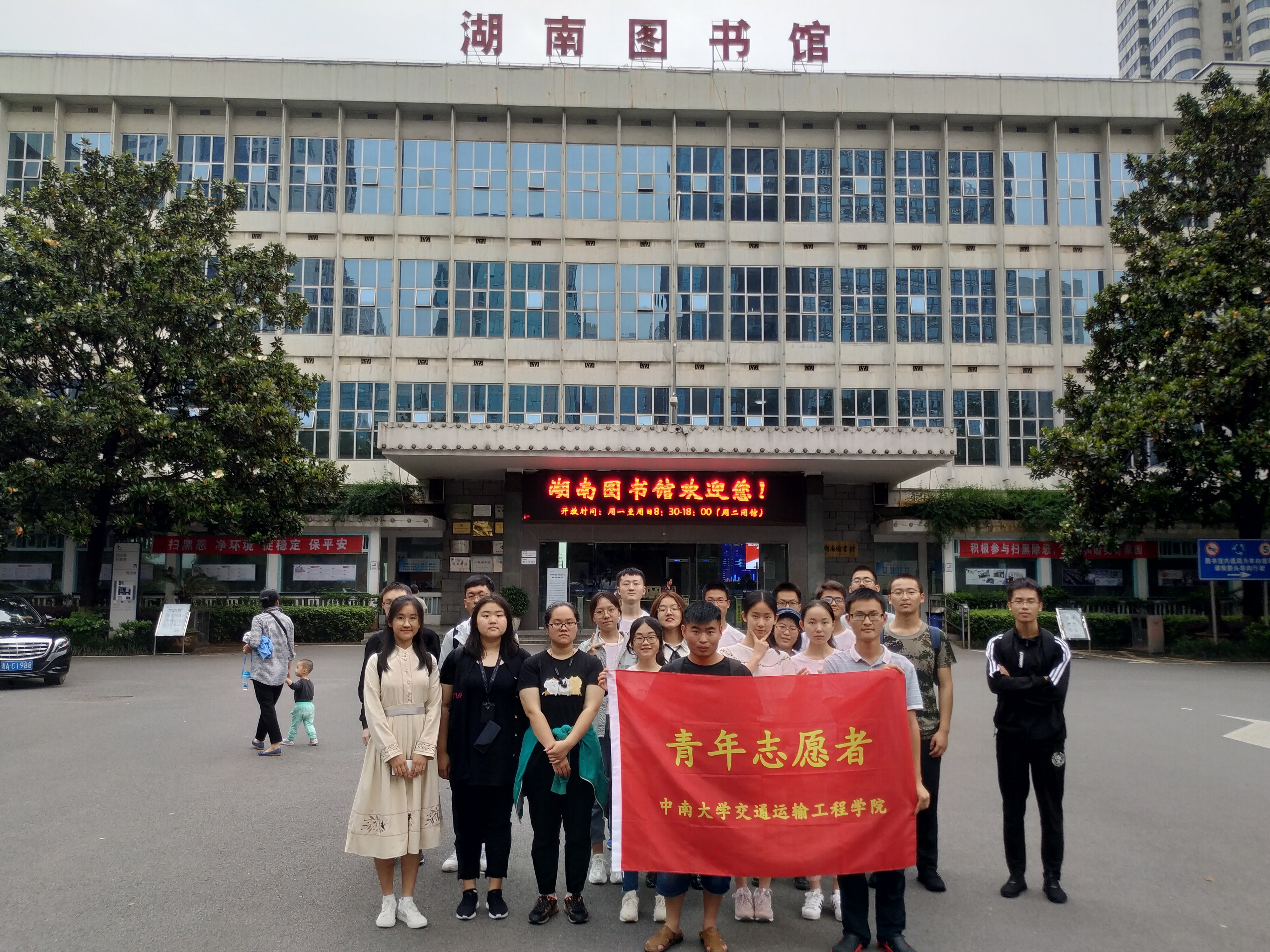 的志愿者们顶着炎炎烈日,在二食堂前坪集合一同出发前往湖南省图书馆。下午两点半志愿者们准时到达省图书馆,在负责人与省图书馆工作人员取得联系后领取志愿服,二十名志愿者前往儿童借阅区开始了为期三个小时的志愿服务工作。