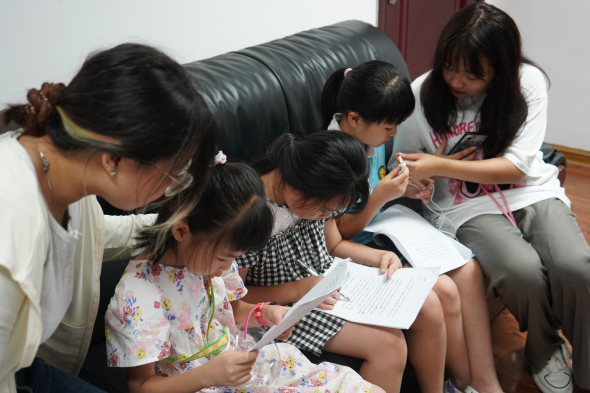 在实验小课堂结束后,我们邀请到六位小朋友参与录制瑶族文化故事的讲述,她们分别选择了耍歌堂、瑶绣、盘王歌这三个故事进行讲述,在团队成员的陪同下一起学习故事,讲述故事,用自己的声音为社会公益奉献爱心。