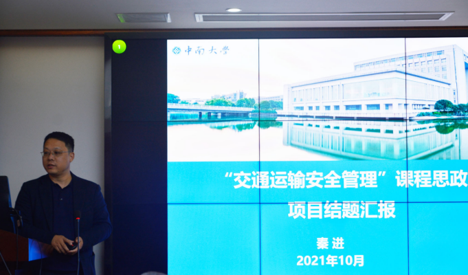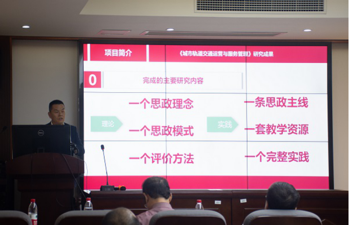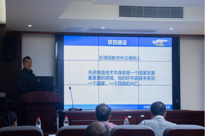 在陈维亚副院长宣布完答辩规则后,答辩环节正式开始。首先是九位教师依次上台代表各自小组进行结题汇报。刘辉教授(图2)在《电力电子技术课程思政》建设过程中得出“改革建设一直在路上,要常学常新、常思常悟、常研常得”。罗意平教授(图3)谈到:“先进制造技术本身就是一个国家发展最重要的领域,他的好坏直接关系到一个国家、一个民族的兴亡。”他们团队在授课时采用翻转课堂的模式,充分发挥学生们的主观能动性,对学生们进行价值塑造,厚植立德树人情怀。教学效果的准确判断会对教学质量起到反馈激励作用,陈维亚教授(图4)在《城市轨道交通运营与服务管理》的教学实践中,总结出了符合隐形化、多样化、共情化三原则的教学效果评价方法。秦进教授(图5)团队则在授课中不断拓展课程内涵,构建出了线上线下结合、理论实践融合、中英文融合的课程体系。