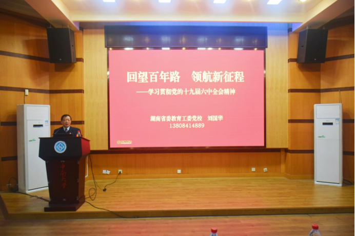 以国际报告厅为主会场举行“党的十九届六中全会精神”专题宣讲会,另外设置6个分会场,采用腾讯会议直播的形式组织全体党员参与学习。本次宣讲会邀请湖南省委教育工委党校常务副校长、省高校干部培训中心主任、书记刘国华教授担任主讲,必威