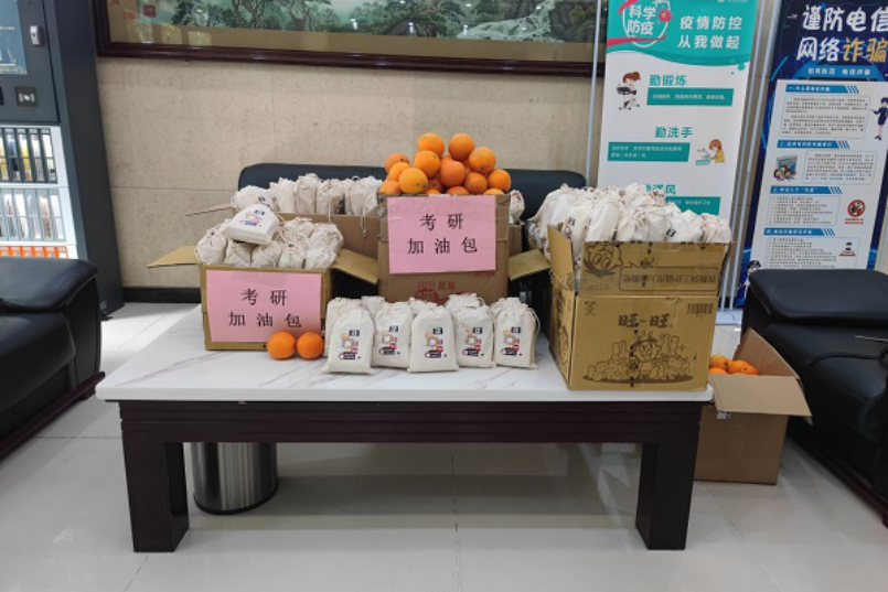 22号上午8:00,2018级辅导员陈晨老师和学生干部们早早便在在交通楼大厅准备好了考研加油包。一份份精美的福袋整齐地摆放其中,福袋里包括寓意马到成功的脐橙、寓意好事发生的柿子和花生形状的钥匙扣、寓意牛气冲天的旺仔牛奶等心意满满的小礼物,以及对考研学子较为实用的暖宝宝、巧克力和棒棒糖。