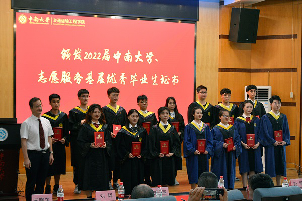 2022届志愿服务基层优秀毕业生荣誉名单,并对他们进行表彰。交通院党委书记贺志军为获奖的毕业生颁发荣誉证书。