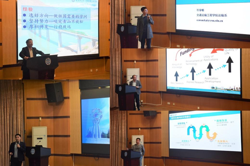 各系所老师上台分享学术经验。成庶老师就不同研究方向的可能就业企业、用户单位及科研院所进行了讲解,并围绕“主动、合作、全局观、果敢”四个关键词谈论了自己的个人研究经验。易兵老师围绕高水平期刊推荐、学术科研经验分享、发展前景与就业方向等方面进行了分享,强调了阅读科技论文的三步法。岑学楷老师结合自身经历从期刊推荐、英文论文写作、留学深造与考研保研申博等方面进行了分享。李双琳老师结合物流工程的学科特色,分享了相关的中英文高水平期刊,并阐明了科研选题的顶层设计的内涵。王中钢老师从自身与铁路结缘的经历谈起,强调了要选择祖国需要的科研方向,有咬定青山不放松的坚持以及厚积薄发、行稳致远的态度。