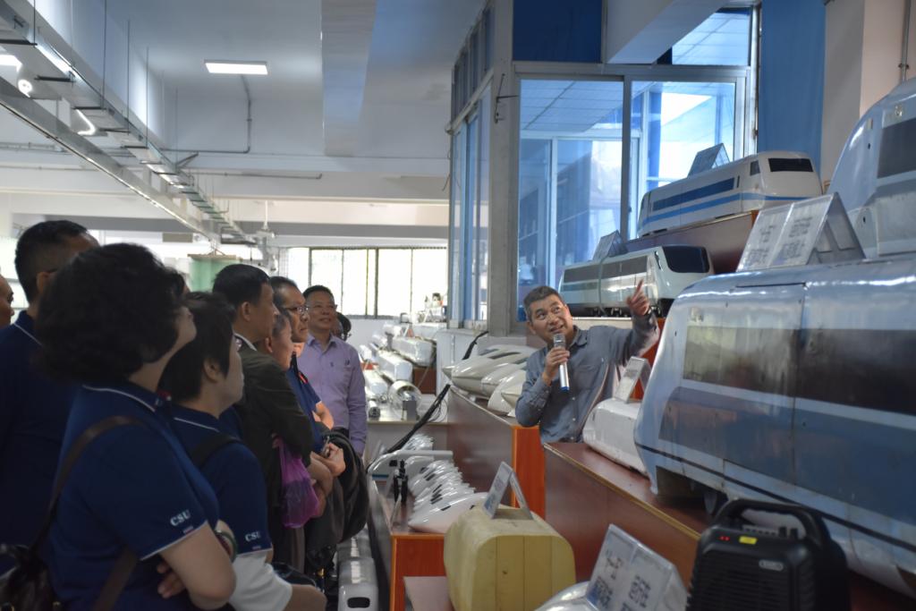 首先,校友们参观了高速列车研究中心动模型实验室。在这里,高速中心副主任许平向校友们展示了世界上规模最大、国内唯一的列车气动性能模拟装置,并演示了动模型弹射试验。随着试验台上的列车从眼前飞速掠过,校友们接连赞叹中国智慧之大与中国速度之快。接着,许老师结合列车模型详细讲述了中国列车从中原之星到复兴号的发展历程。他提到,交院师生在复兴号列车外形设计和高寒高速列车运行等方面的研究对推动中国铁路事业蓬勃发展具有重要贡献。